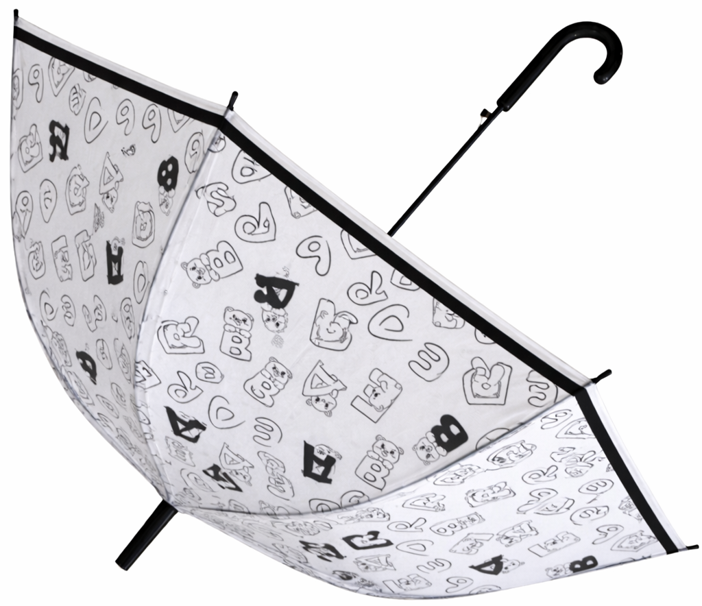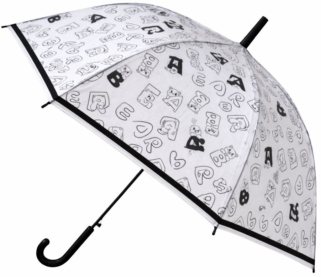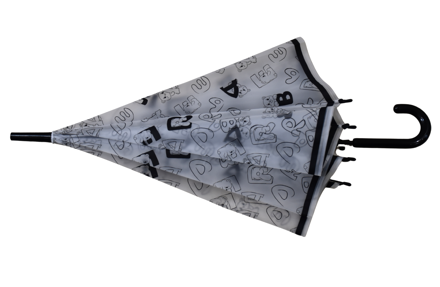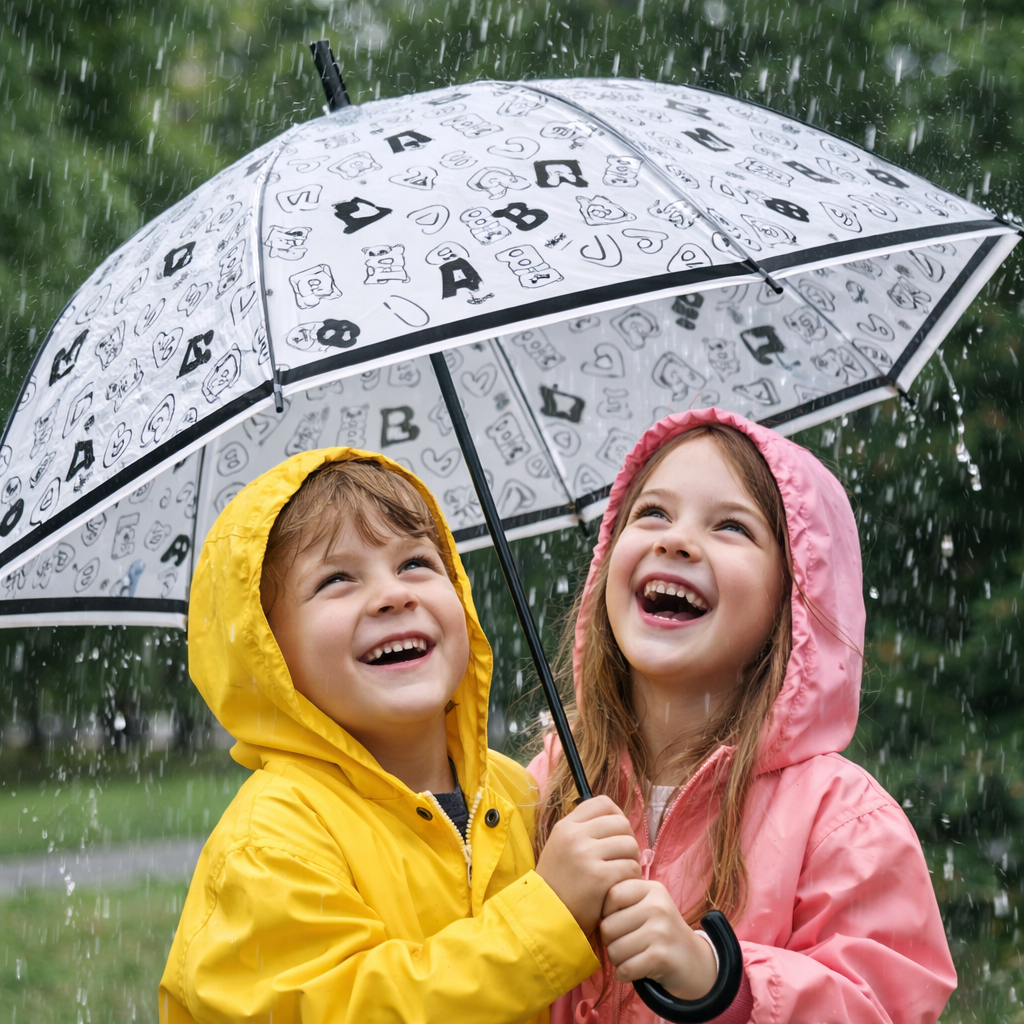 Make rainy days stylish and fun with this kids transparent umbrella, designed with a playful black and white alphabet and doodle pattern that sparks curiosity and creativity. The clear canopy improves visibility, helping children stay aware of their surroundings while walking in the rain. Built with a lightweight yet sturdy frame, this umbrella is easy for kids to carry and strong enough to handle windy weather. The rounded safety tips, smooth edges, and comfortable curved handle make it a parent-approved choice for school, travel, and everyday use. A perfect blend of safety, durability, and fun—this umbrella is an ideal rainy-day companion for kids.