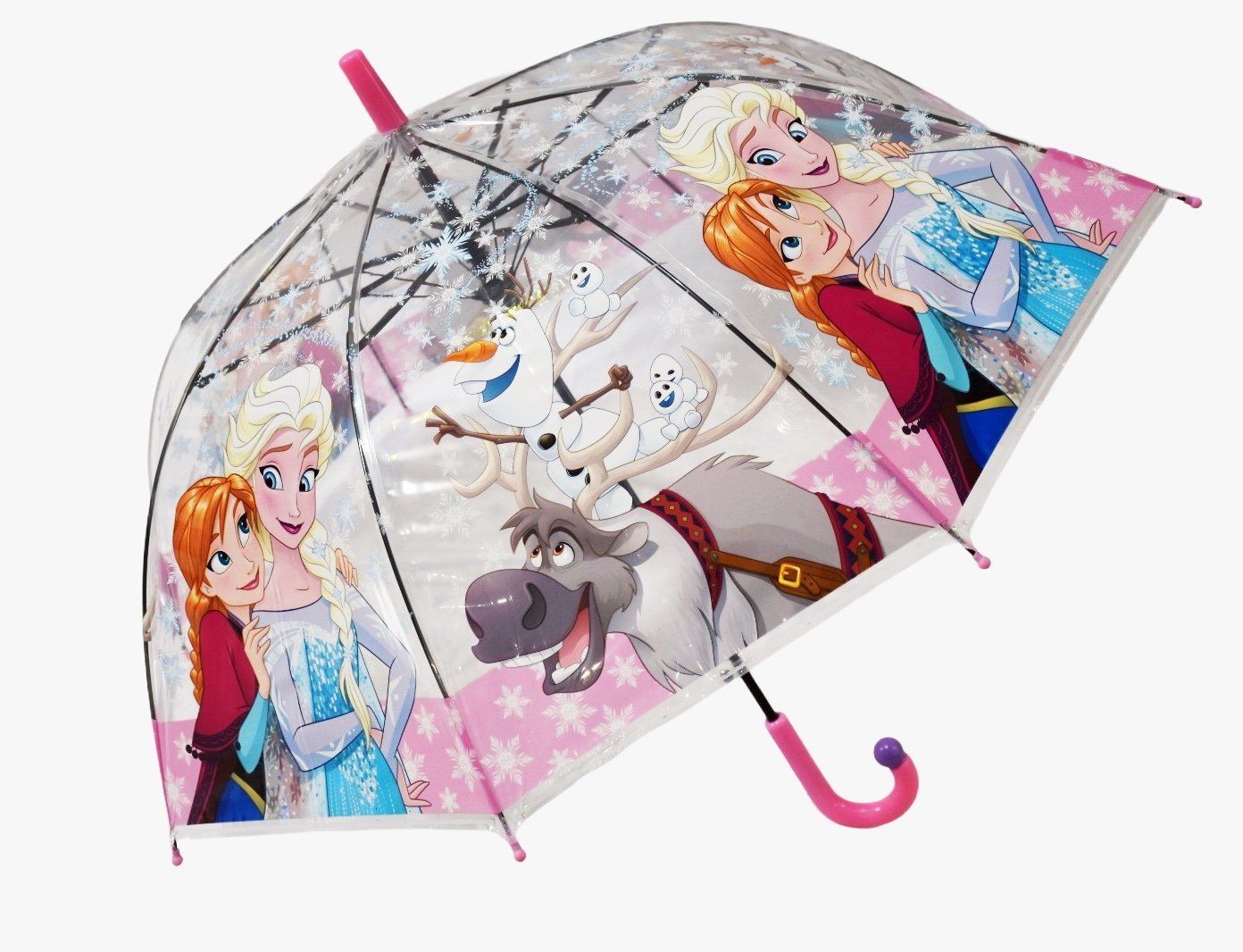 Turn rainy days into magical adventures with this beautiful pink princess clear dome umbrella for girls. Designed with charming princess artwork and snowflake patterns, this transparent bubble umbrella provides full head-to-shoulder coverage while allowing children to see clearly as they walk. The dome-shaped canopy offers extra protection from rain and wind, keeping your little one dry and comfortable. Made from durable waterproof material with a lightweight frame, this umbrella is easy for small hands to carry. The curved hook handle ensures a secure and comfortable grip, making it perfect for school, daycare, travel, and outdoor fun. A wonderful gift idea for birthdays, holidays, or back-to-school season, this princess umbrella adds style, fun, and protection to every rainy day.