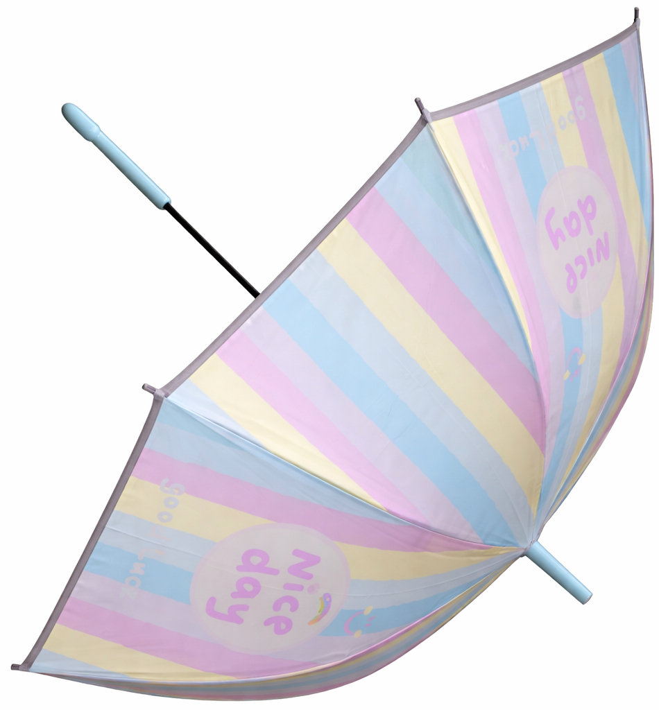 Kids “Nice Day” Pastel Rainbow Umbrella – Colorful Striped Children’s Rain Umbrella with Light Blue Handle