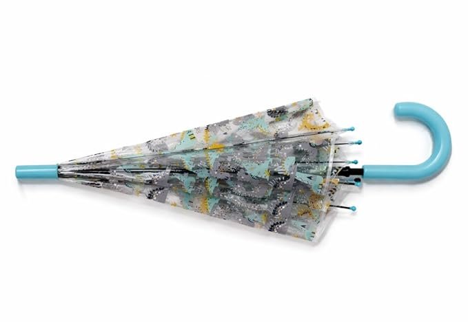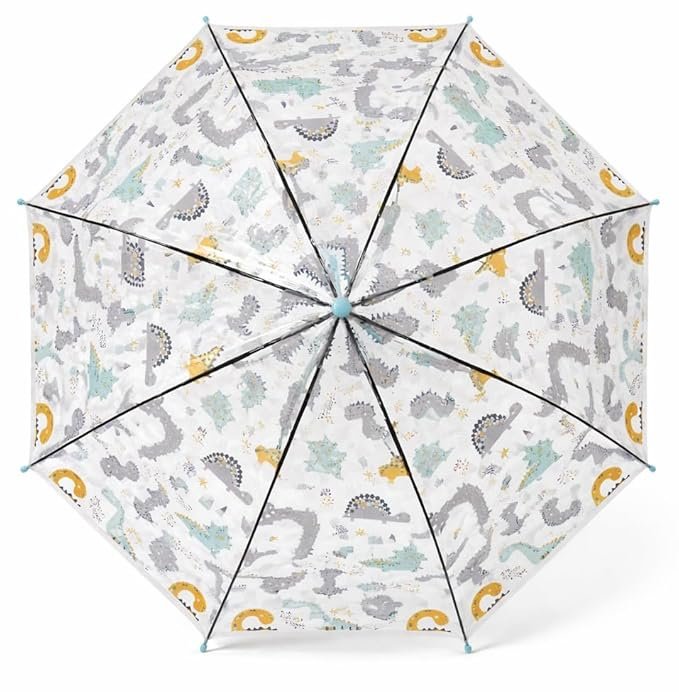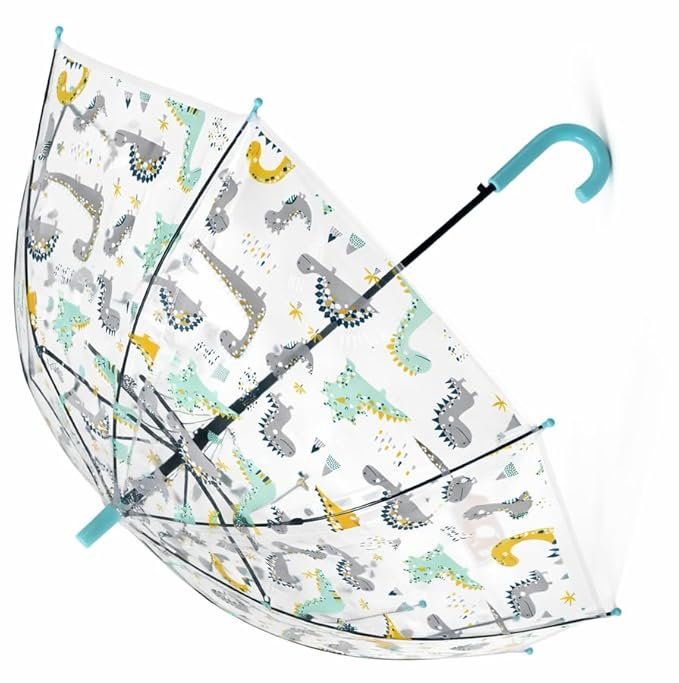 Make rainy days fun and safe with this Kids Transparent Dinosaur Umbrella. Designed with a clear dome canopy, it allows children to see clearly while staying fully protected from rain and wind. The playful dinosaur print in grey, teal, and yellow adds a cheerful touch that kids enjoy carrying to school. Built with a sturdy metal frame and strong ribs, this umbrella offers durability without being heavy. The smooth turquoise hook handle ensures a comfortable grip, making it easy for children to use independently. Perfect for boys and girls, this lightweight and wind-resistant umbrella is a must-have monsoon essential for everyday school and outdoor use.