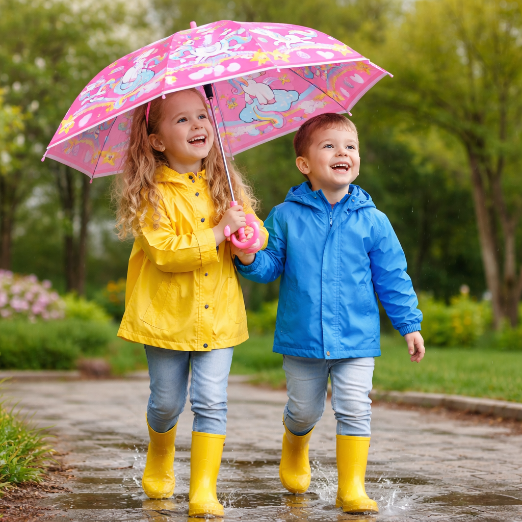 Make rainy days magical with this Blue Unicorn Umbrella for Kids, specially designed for girls and boys who love cute and colorful accessories. The umbrella features an adorable unicorn print, strong PVC canopy, and a lightweight frame that is safe and easy for children to carry. Its rounded edges, anti-slip handle, and wind-resistant design ensure maximum safety and comfort for little hands. Perfect for school, travel, daily use, monsoon season, or gifting. Whether your child is walking to class or enjoying a rainy-day adventure, this Unicorn Kids Umbrella adds fun and protection every step of the way.