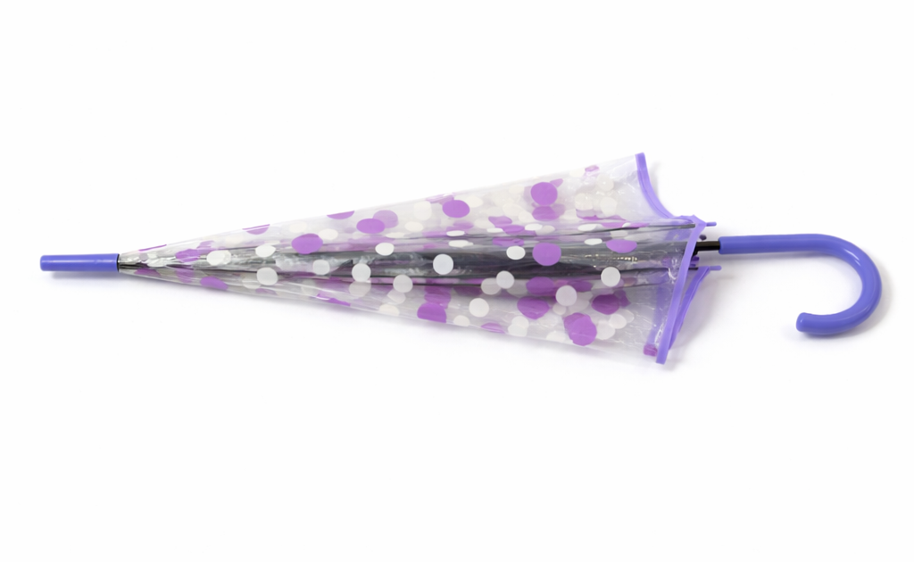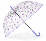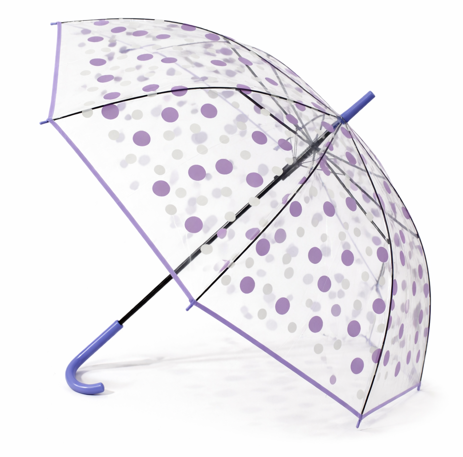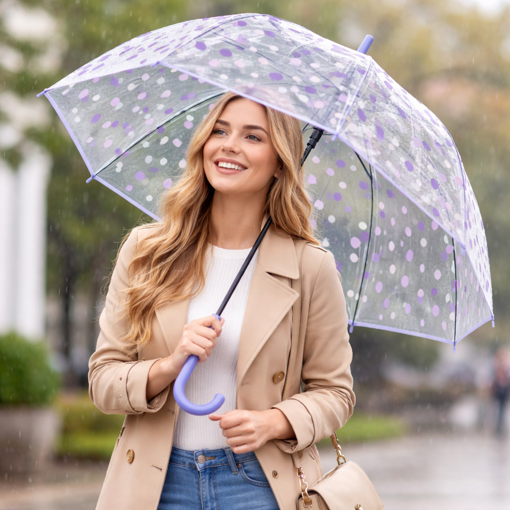 Stay stylish and dry on rainy days with this Clear Dome Bubble Umbrella featuring playful pink and white polka dots. Designed with a transparent canopy for maximum visibility, this umbrella allows you to see clearly while staying fully protected from wind and rain. The dome-shaped bubble design offers extended coverage, shielding your face, hair, and shoulders from heavy rain. Built with sturdy black metal ribs and a strong central shaft, this umbrella is lightweight yet durable for everyday use. The comfortable pink J-shaped handle provides a secure grip and easy carrying. Perfect for women, teens, and kids, this fashionable rain umbrella combines function and style — making it ideal for school, travel, weddings, photoshoots, and everyday rainy weather. Add charm to gloomy days with this cute and reliable clear bubble umbrella!